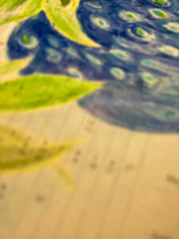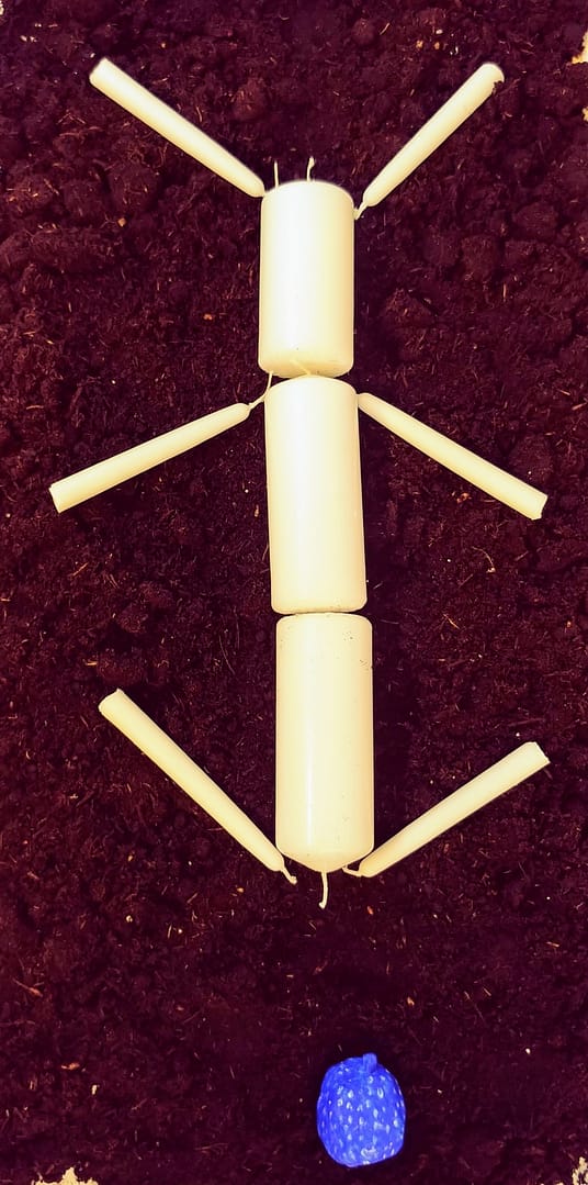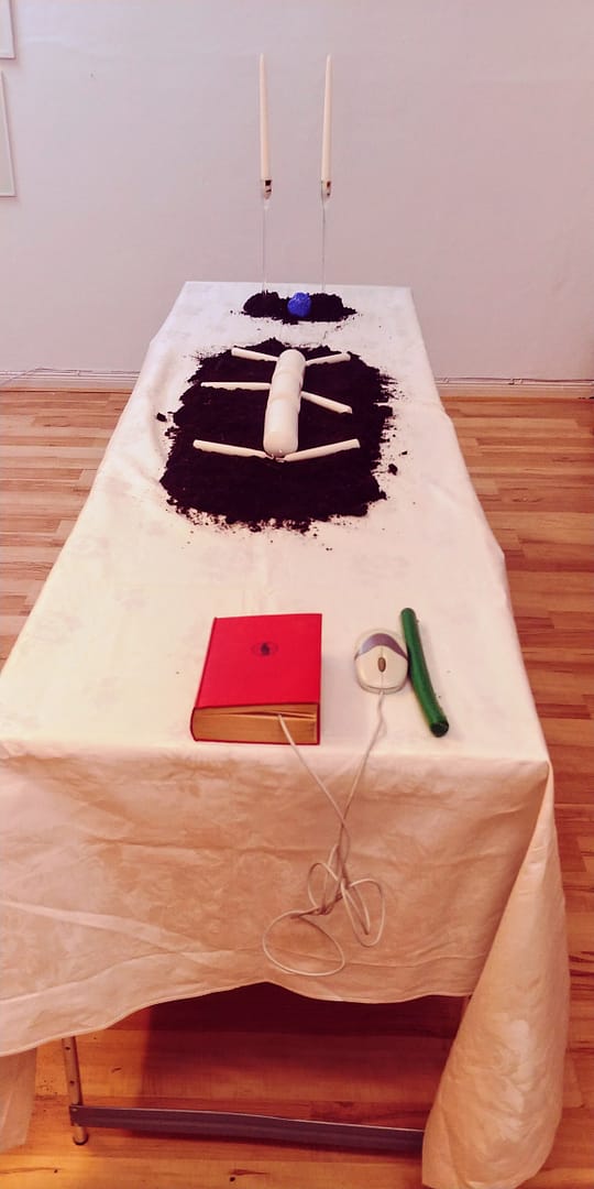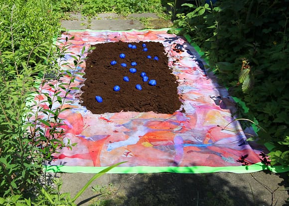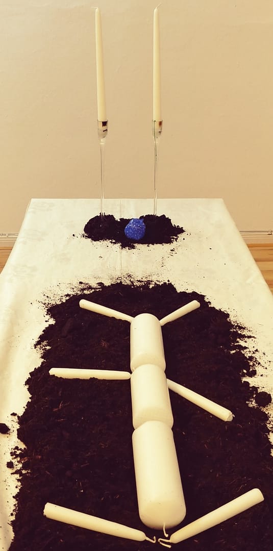 ist bedeckt mit dem Nachdruck einer mit Farbstift bezeichneten Tischdecke/ KUNSTHAUSHALT. Darauf als Symbol der nährenden ERDE werden 20l Pflanzenerde als Beet arangiert, aus dem blaue Erdbeerobjekte herauswachsen. Blau als eine Farbsprache, mit der die Erdbeere ein weites Assoziationsfeld anbietet. Mittendrin wird ein vielarmiger Kerzenleuchter/ Rot/ wenn möglich, platziert