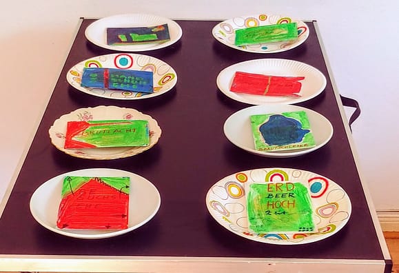 18 Teller unterschiedlicher Art werden gefüllt mit Hochzeitsbegriffen, die auf Karten gemalt wurden. Rituale, Gebräuche, Bezeichnungen lassen die unterschiedlichsten Aspekte einer HOCHZEIT erahnen. Die Farben Rot- Blau- Mint sind die Farben des Festivals, die auch als Streifen den Tisch in 2 Teile teilen.Die Tischplatte bleibt unbedeckt/ roh. Die ganze Vielheit/ Buntheit einer HOCHZEIT entfaltet sich in den bemalten und beschrifteten Karten als Hochzeitessen
