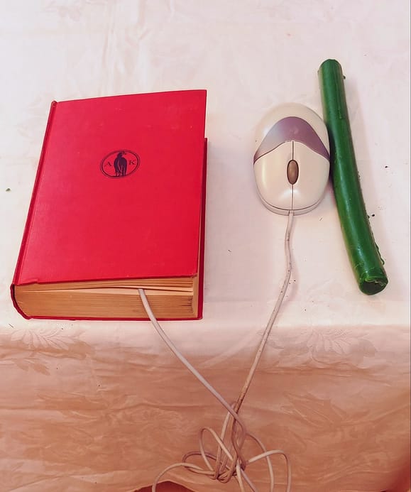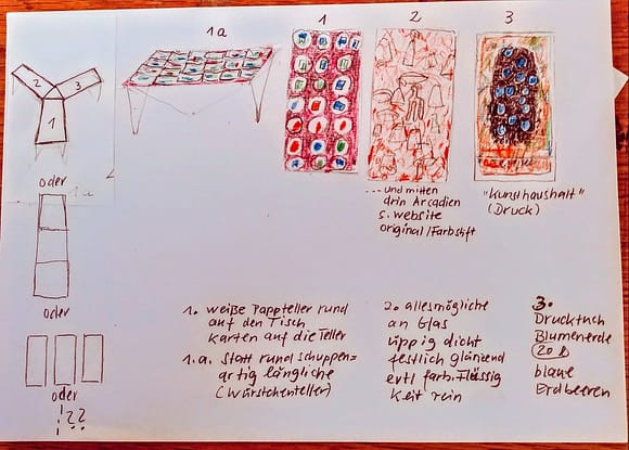 Dieser Tisch ist bedeckt mit einer Originalzeichnung auf  der Tischdecke „ .. und mittendrin Arcadien“. Gläser und anderes Glasgeschirr „bevölkern Arkadien“ als blinkendes festliches Gepränge, aber auch als zerbrechliches Material mit einer erweiterten Interpretationsmöglichkeit. Das überwiegende ROT der Zeichnung bleibt sichtbar, in einer Art beweglicher Veränderung