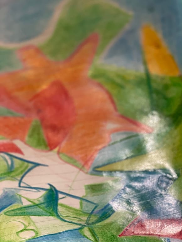 der Tisch ist weiter bedeckt mit dem Tuch von Tisch 3a. Die Gläser fallen weg, dafür sind 2 Formen aus den Pattern/Musterformen von Andreas Peschka entwickelt, und individuell bezeichnet, entstanden und als Montage auf die Decke aufgelegt: ein Doppeldreieck / Grün und in offener Form zusammengefügt und ein Quadrat/ blau in genauer Passform aneinander gefügt und aufgelegt