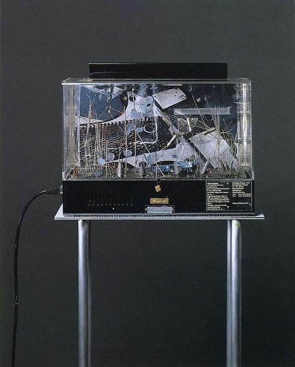 Blaue Pistole, 1973. Sprechender Kasten, 39 x 41 x 21 cm. Rückwand: Offsetdruck. Handbedienung. Endlostonband mit Ton von Irma Hünerfauth. Text: Meta Kristall. Foto: Hans-Wulf Kunze, Magdeburg.