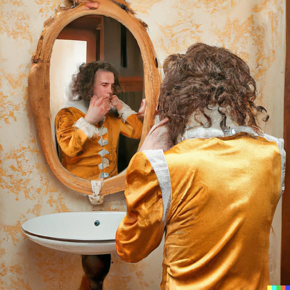 »Dann kann er sie nicht tragen, teilte er seinem Gesicht im Spiegel mit. Etikette bleibt Etikette. Seine Mutter bringt er um, aber graue Hosen kann er nicht tragen (…). Das pferdehafte Gesicht, das helle untonsurierte Haar, das fleckig getönt war wie matte Eiche (…) erinnerten an den Prälaten, Patron der Künste im Mittelalter. Ein freundliches Lächeln brach gelassen über seine Lippen.« (S. 11)