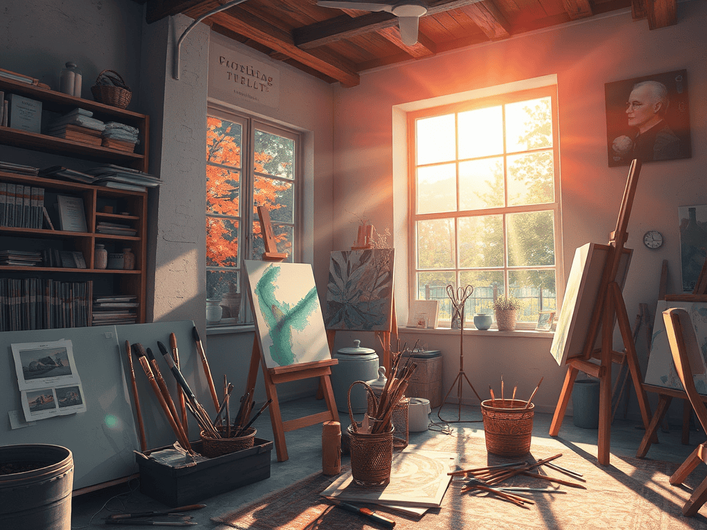 Create a highly detailed and sharp-focused image that embodies the essence of "Jeder Tag ist eine Malerin". Featuring a serene art studio scene inspired by the work of Lili von Asten. Capture vibrant colors and light streaming through a large window, illuminating various art supplies, brushes, and canvases scattered around the room. Include a soft, warm ambiance to evoke creativity and inspiration. Use high resolution for clarity and detail, emphasizing the textures of the materials and the beauty of the sunlight.