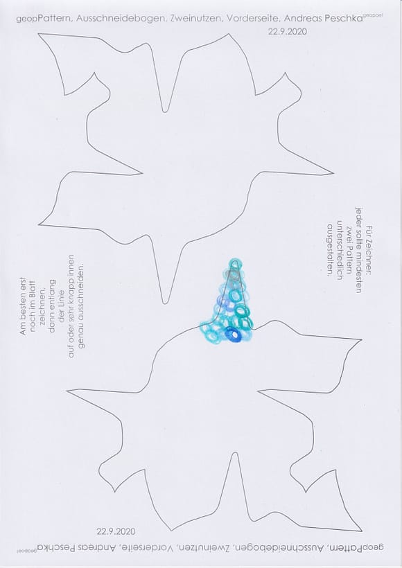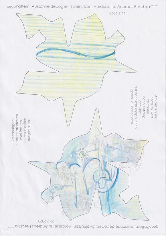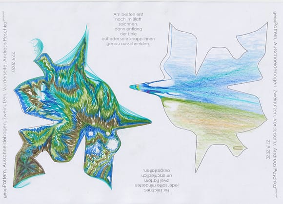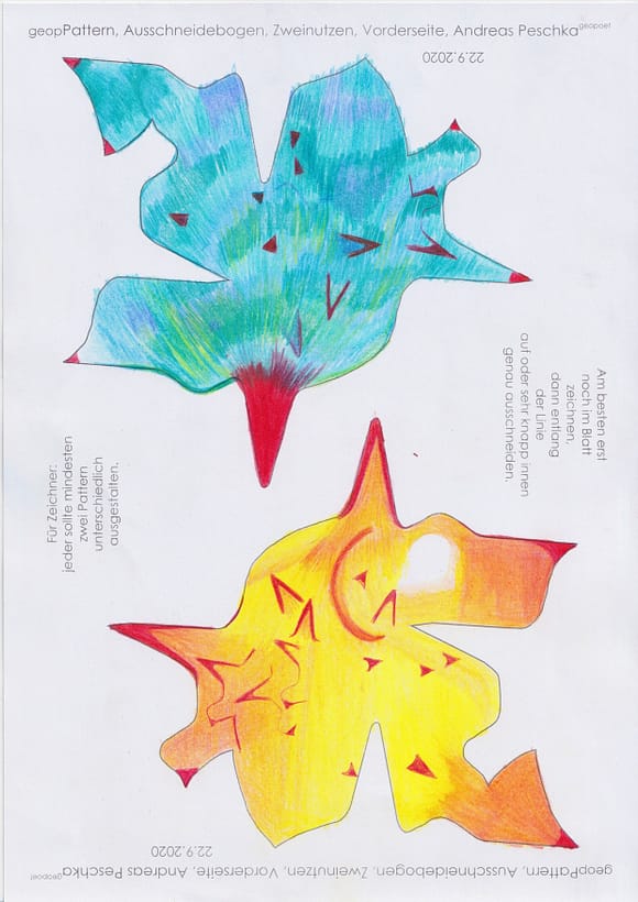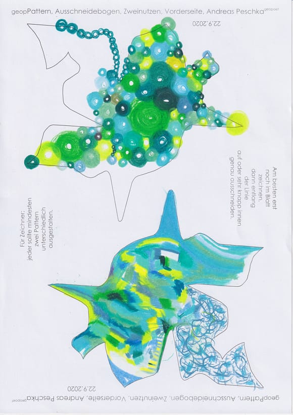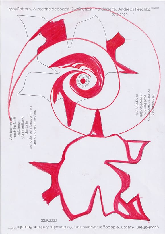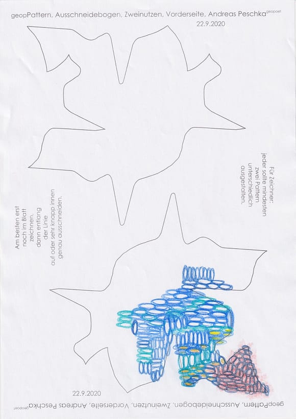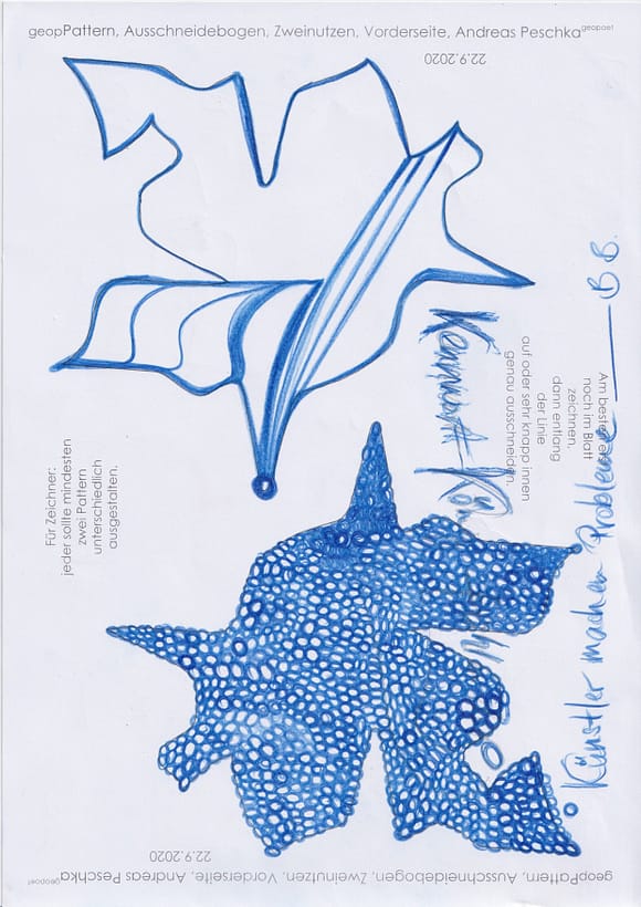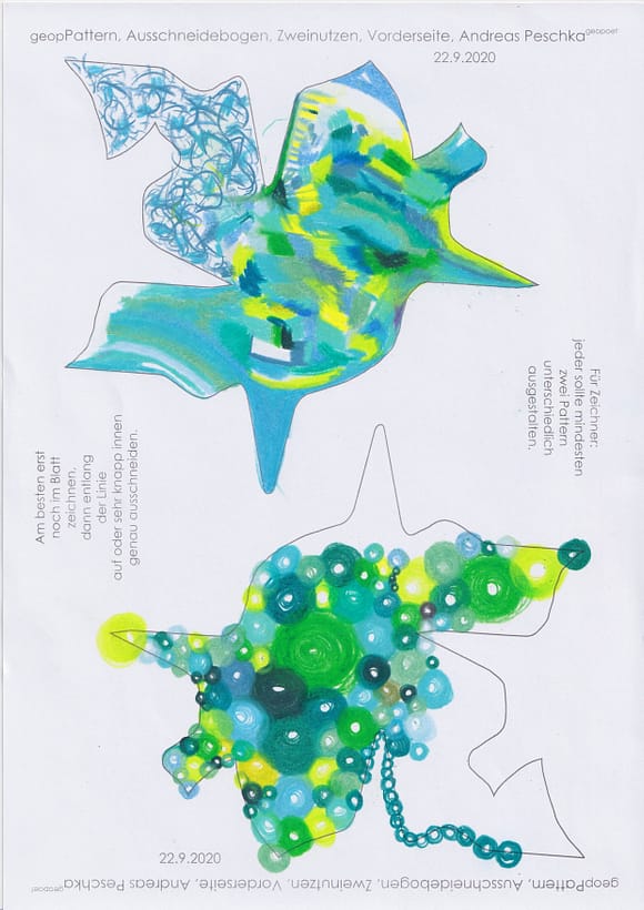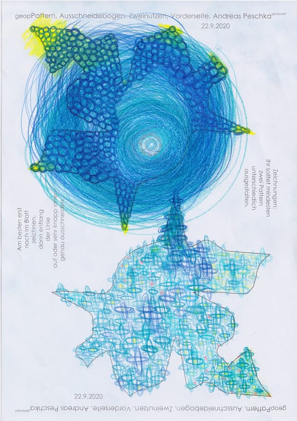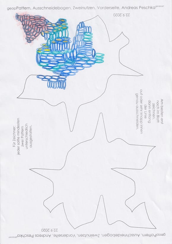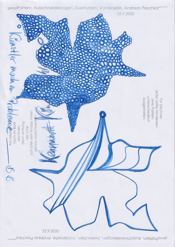 Das künstlerische Prinzip und Konzept fusst zudem darauf, dass wir aktuell an dem „#Patternmachwerk“ und „ProjektRömerhof“ von @Andreas Peschka mitarbeiten. Und zwar nach seinen zeichnerischen und schriftlichen Vor- und Massangaben. Den digitalen Schablonen und Zweinutzbögen als PDF oder dem Serienbrief, den er mit nur einem Pattern aus Japanpapier versendet. Welche leicht und nahezu simpel mit und ohne Anleitung zu gestalten (oder gleich selbst auszudrucken) sind. Da sich die Zweinutzbögen der Patternpaare oder nur ein Pattern aus Japanpapier nach der Selbstgestaltungsphase (Do It Yourself = DIYs) problemlos digitalisieren, fotografieren und auch wieder einscannen lassen. Stichwort: #Kreislaufwirtschaft *Kreislaufwirtschaften