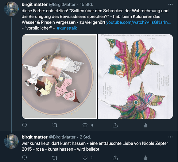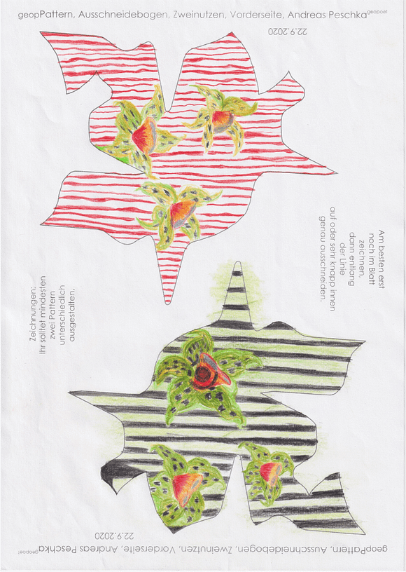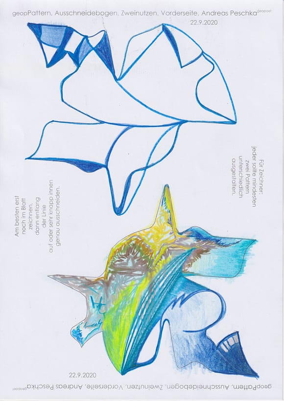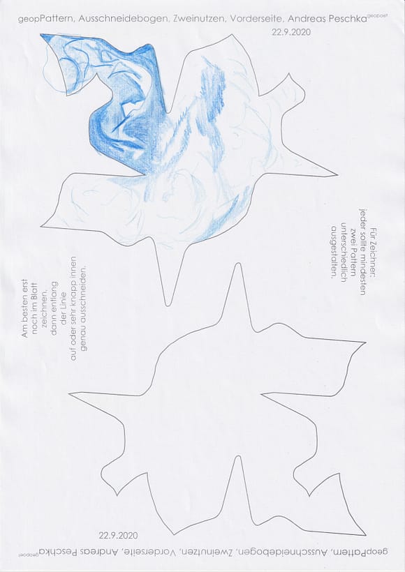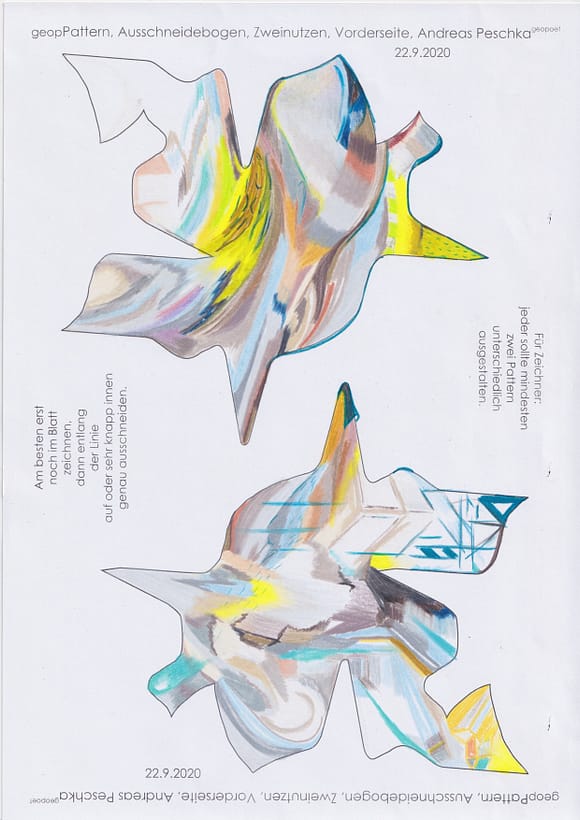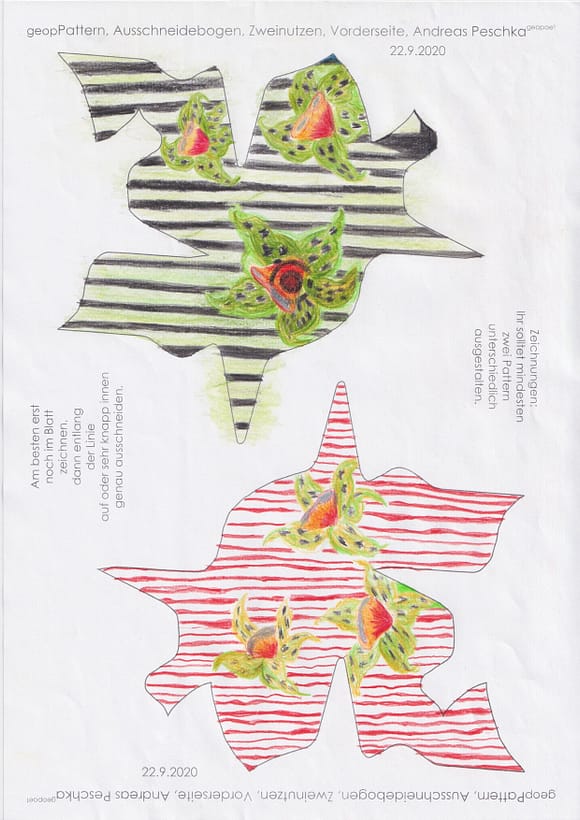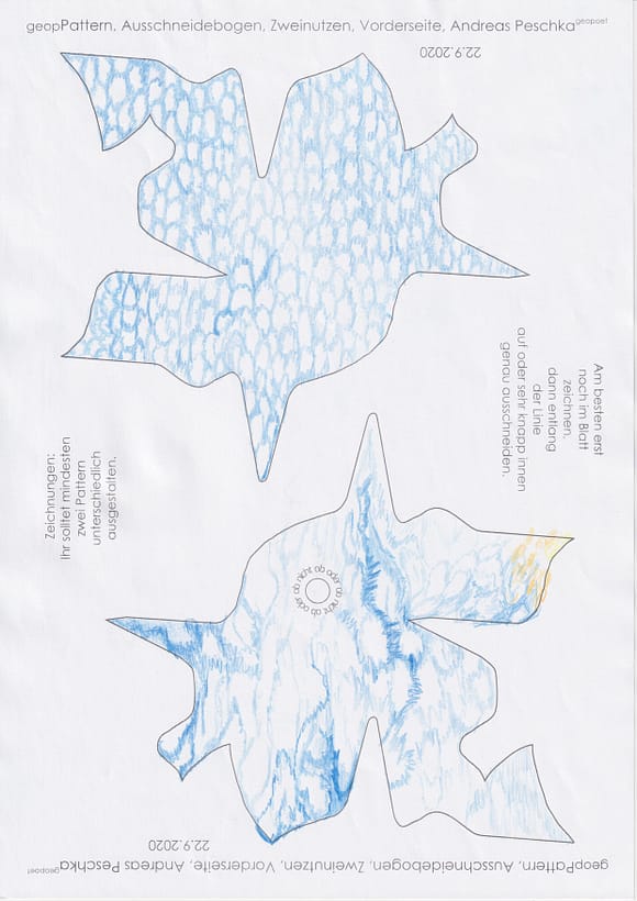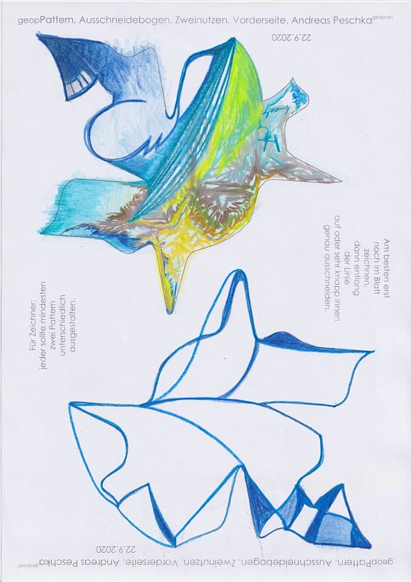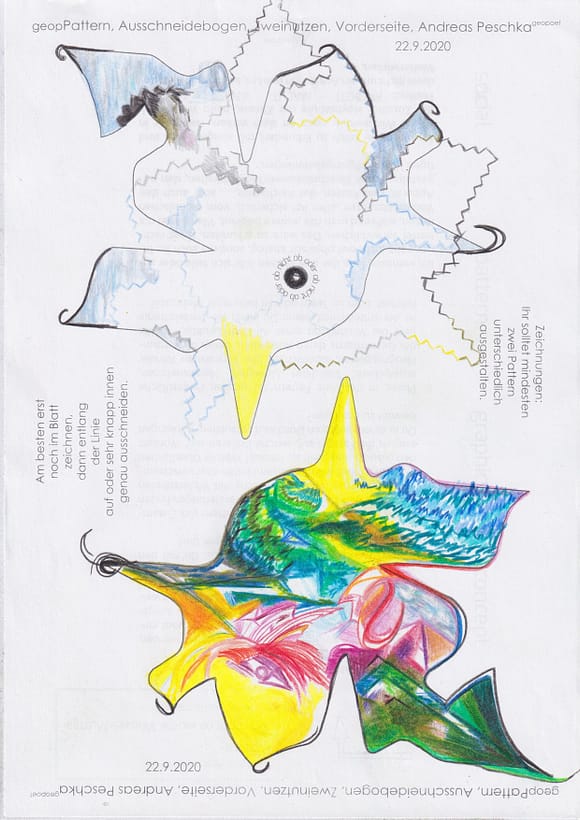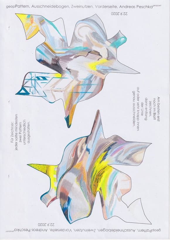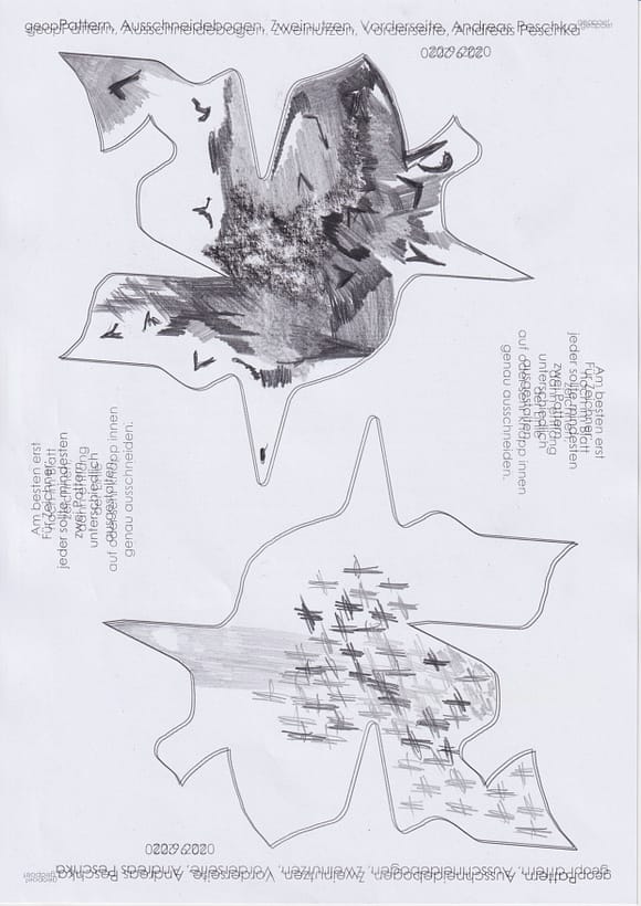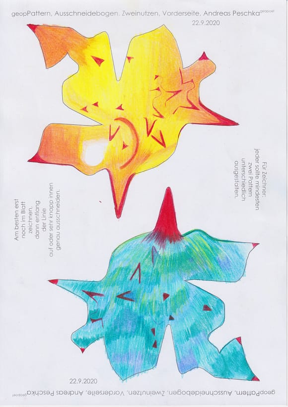 Das künstlerische Prinzip und Konzept fusst zudem darauf, dass wir aktuell an dem „#Patternmachwerk“ und „ProjektRömerhof“ von @Andreas Peschka mitarbeiten. Und zwar nach seinen zeichnerischen und schriftlichen Vor- und Massangaben. Den digitalen Schablonen und Zweinutzbögen als PDF oder dem Serienbrief, den er mit nur einem Pattern aus Japanpapier versendet. Welche leicht und nahezu simpel mit und ohne Anleitung zu gestalten (oder gleich selbst auszudrucken) sind. Da sich die Zweinutzbögen der Patternpaare oder nur ein Pattern aus Japanpapier nach der Selbstgestaltungsphase (Do It Yourself = DIYs) problemlos digitalisieren, fotografieren und auch wieder einscannen lassen. Stichwort: #Kreislaufwirtschaft *Kreislaufwirtschaften