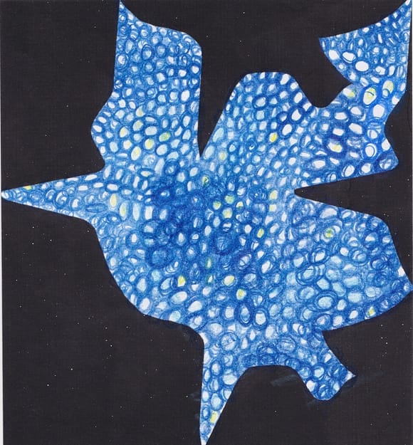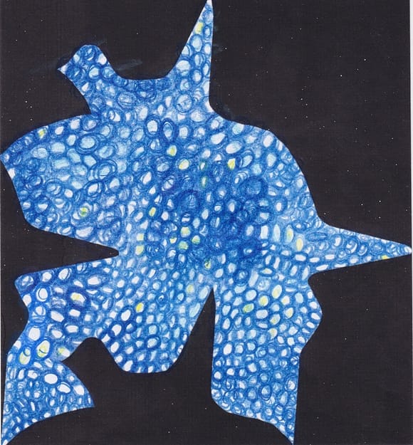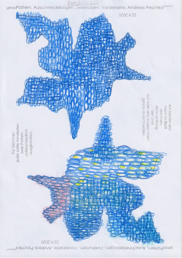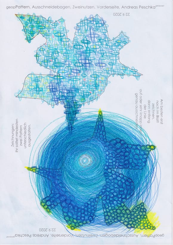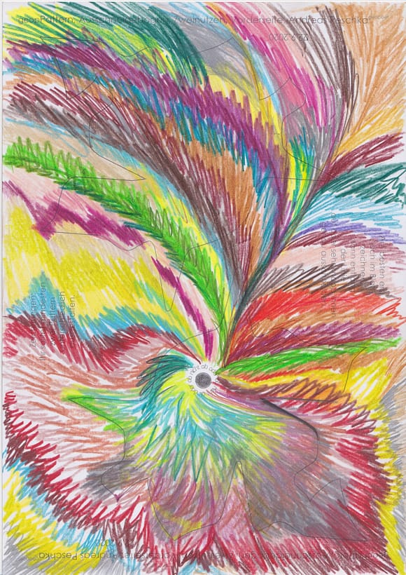Wobei das analoge Arbeiten in der Gruppe des selber Zeichens an einem #Japanpapier gemeinsam zurzeit vorgezogen wird, vor dem Digitalen. Die #Patternform an sich hat kaum Ecken, Kanten und Spitzen. Sie evoziert die pure künstlerische Vorstellungswelt, Weltanschauung und das Weltbild: bestehen aus einem Genpool, Ressource, Künstliche Intelligenz usw., welche sich in ständiger Mutation, Metamorphose, Veränderung sowie Transformation und Gestaltung befindet. In alle Richtungen „tentakelt“, wie er – du – @schwankungsweite Andreas Peschka es nennt und immerwieder zu sagen pflegt. Jede:r bekommt schnell das Gefühl oder Gefühle dafür, dass selbstgestaltete #Pattern – #Geobpattern – #Patternpaare – #Wagnispatternpaare usw. flüchtige – im kosmischen, elektronischen und digitalen Netzwerk der Internetzion sind. Matrix eben _ Matrix _ oben Matrix _ unten = Muster. Einzelbild. Ein Bild, so klein. wie #Seifen- und Luftblasen, Zellen und Organellen, die wie Satelliten am Sternenhimmel punktuell auftauchen, ständig herumfliegen und sofort wieder verschwinden und verblassen, sobald der Strom und die Elektrizität nicht mehr fliessen sollten. Mediale Bilderfluten überblenden schnell die einzelnen #Patternmachwerke oder #Wagnispatternpaare. Deshalb werden die #Patternpaaare behutsam behandelt, um diese zu einem Kosmos, der ganz besonderen Art und Weise immer wieder zusammenzuschieben, auszustellen und zu präsentieren.