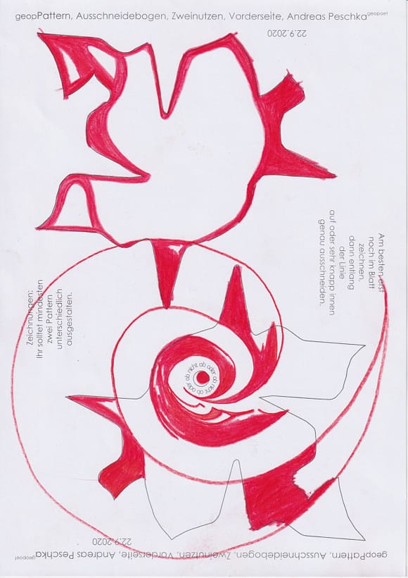 Andreas Peschka schneidet die zugesandten #geoPattern #geopPattern #geobPattern und #Patternpaare in jedem Fall ohne Praktikus oder Praktikant technisch eigenhändig und selbstständig passgenau & sehr gewissenhaft aus. „Hier macht der Chef noch selber Schinken“, wird es kommentiert. Andreas fügt die #Pattern in die digitale Scheibetafel (Miroboard) ein. Manche Pattern legt er gerne – vereinzelt – in die kreisrunde Rahmung – der virtuellen Petrischale – für mögliche weitere Experimente, Untersuchungen und Forschungen. Forschungsversuche: