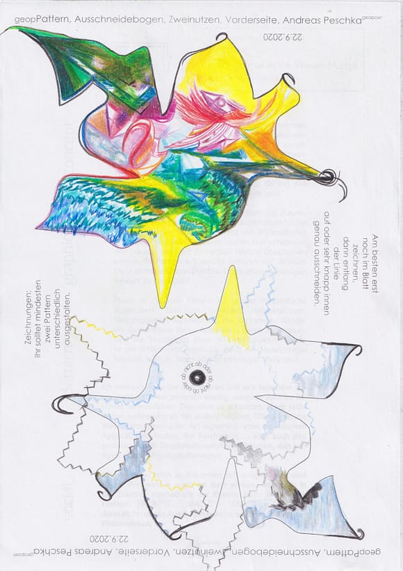 durch #pattern im paar #geobpattern sie zusammen, systematisch, wie im schau-m-bad, organisch bis anorganisch träumend, schäumend fliegen. auffliegen?! zu den #experimenten: wahrnehmungen, die farbige ausgestaltungen der #form des patterns werden, welche vor-gegeben ist. ausschneiden und versenden der pattern als post. „Auf der Höhe der Zeit“ zu #erdbeerhochzeit-en voranschreitend – täglich – alltäglich – analoges – digitales – produzierend. die #paare möchten an den #erdbeerhochzeit-en, am #kunsttalk als gäste am konferenztisch teilnehmen.