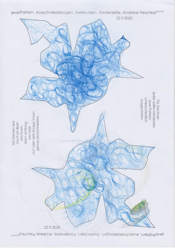Das künstlerische Prinzip und Konzept fusst zudem darauf, dass wir aktuell an dem „#Patternmachwerk“ und „ProjektRömerhof“ von @Andreas Peschka mitarbeiten. Und zwar nach seinen zeichnerischen und schriftlichen Vor- und Massangaben. Den digitalen Schablonen und Zweinutzbögen als PDF oder dem Serienbrief, den er mit nur einem Pattern aus Japanpapier versendet. Welche leicht und nahezu simpel mit und ohne Anleitung zu gestalten (oder gleich selbst auszudrucken) sind. Da sich die Zweinutzbögen der Patternpaare oder nur ein Pattern aus Japanpapier nach der Selbstgestaltungsphase (Do It Yourself = DIYs) problemlos digitalisieren, fotografieren und auch wieder einscannen lassen. Stichwort: #Kreislaufwirtschaft *Kreislaufwirtschaften
